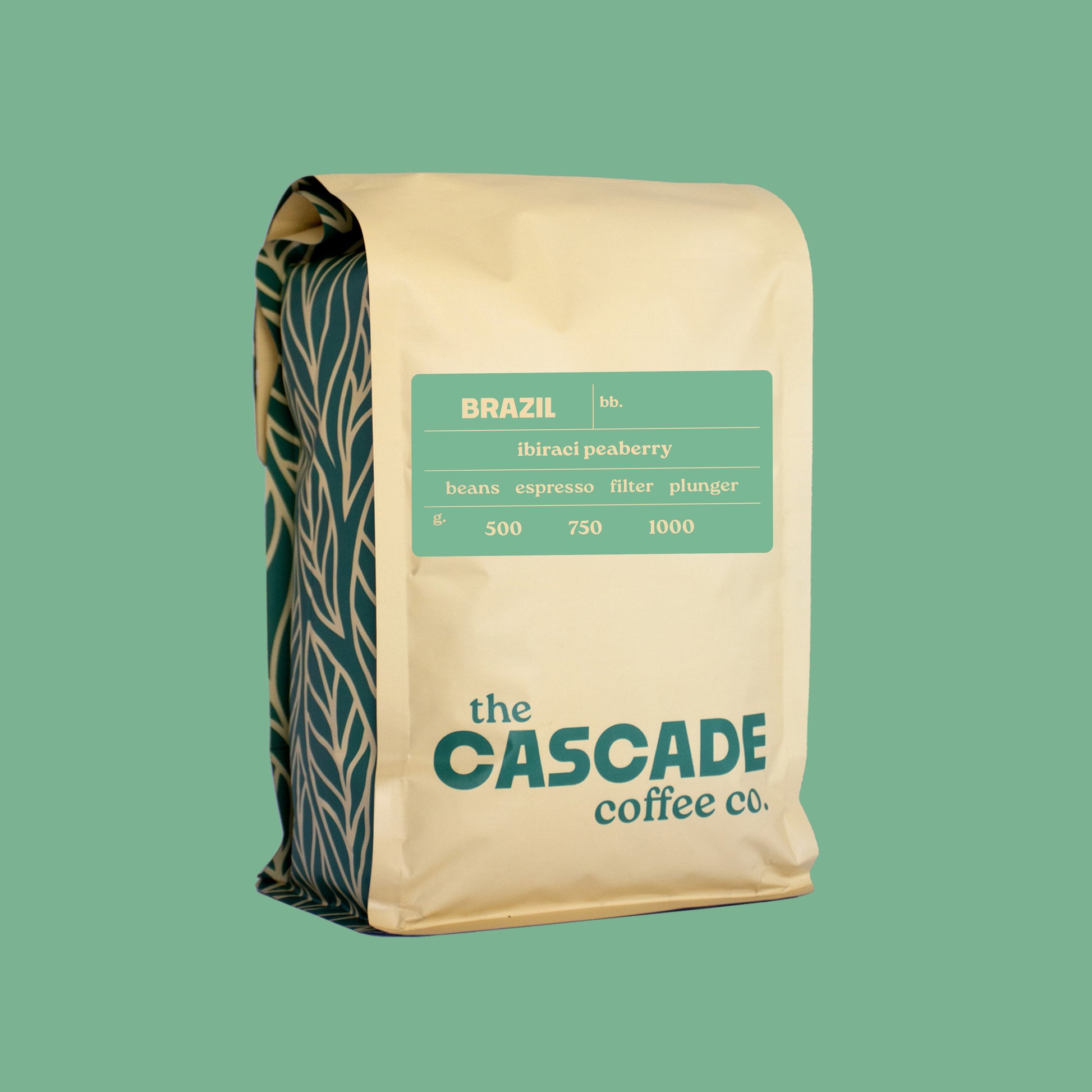 Specialty peaberry Brazil coffee beans NZ, sourced from the Ibiraci region of Brazil, with a smooth nutty flavour, creamy texture, and a sweet finish with notes of milk chocolate.